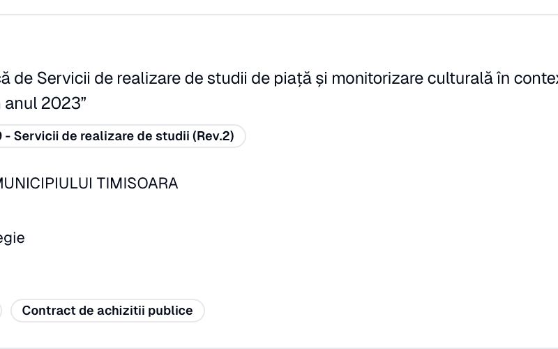 „Abordarea cercetării va pleca de la constatarea că programul TM2023 a pus accentul într-o mare măsură pe nevoia de a completa idealul excelenței culturale și artistice și succesul numeric la public, cu accentul pus pe implicarea și pe efectele resimțite de oameni, public, decidenți și profesioniști, rolul și impactul asupra acestora în proiectele și experiențele culturale, prin abordări cu o dimensiune de intervenție culturală sau socială, prin educație. Analiza va urmări cu precădere dinamica relației cu publicul în cazul proiectelor și evenimentelor din Programul TM2023. Parametrii minimi de validare a cercetării cantitative cu privire la operatorii culturali incluși în Programul cultural național „Timișoara – Capitală Europeană a Culturii în anul 2023”– cum implică aceștia publicul, cu ce succes etc. –, pentru ca studiul să fie considerat reprezentativ: minim 60% dintre entitățile înregistrate în program pe toată durata acestuia, și minim 80% pentru perioada 2021-2023. Durata chestionarului trebuie să fie de minim 20 de minute, de preferat CATI sau CAWI. Parametrii minimi de validare a cercetării cantitative cu privire la implicarea publicului din regiunea Banatului (altul decât cei din Timișoara) pentru a identifica tipologia categoriilor de public, preferințe și tipare de consum, vor presupune: proiectarea și aplicarea a 3 sondaje de opinie pe eșantioane de minim 385 de persoane fiecare, CATI, CAPI sau CAWI”, se menționează în caietul de sarcini al contractului.