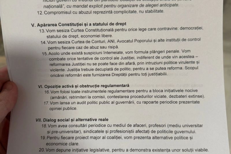 "Anunțăm un manifest adresat tuturor românilor, opoziției politice, mass‑mediei, sindicatelor, mediului de business și tuturor cetățenilor de bună credință care s-au săturat de această guvernare și vor acțiuni concrete. Opoziție totală, opoziție națională, un decalog de măsuri pe care îl transmitem către toți cetățenii României.