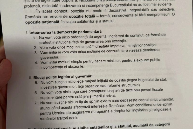 George Simion a prezentat un document‑manifest fără precedent: AUR se pregătește să facă opoziție totală față de coaliția aflată acum la guvernare și cere alegeri anticipate. Manifestul, structurat pe 10 puncte, prevede, printre altele, ca AUR să nu mai voteze nicio ordonanță de urgență supusă plenului Parlamentului României, să voteze orice moțiune simplă inițiată împotriva miniștrilor coaliției aflate la guvernare și să inițieze și să voteze moțiuni de cenzură care vizează demiterea Guvernului Bolojan.