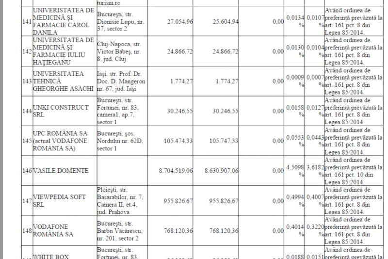 Pe rând, Ghiță datorează bani pentru companiile ASESOFT INTERNATIONAL SA în cuantum de peste 206.200.000 lei, TEAMNET INTERNATIONAL SA în cuantum de peste 442.400.000 lei, INFRATEL NET SRL, în cuantum de peste 17.900.000 lei, 2K TELECOM SRL în cuantum de 395.472.034 lei, TVMP SRL, în cuantum de peste 660.000 lei.