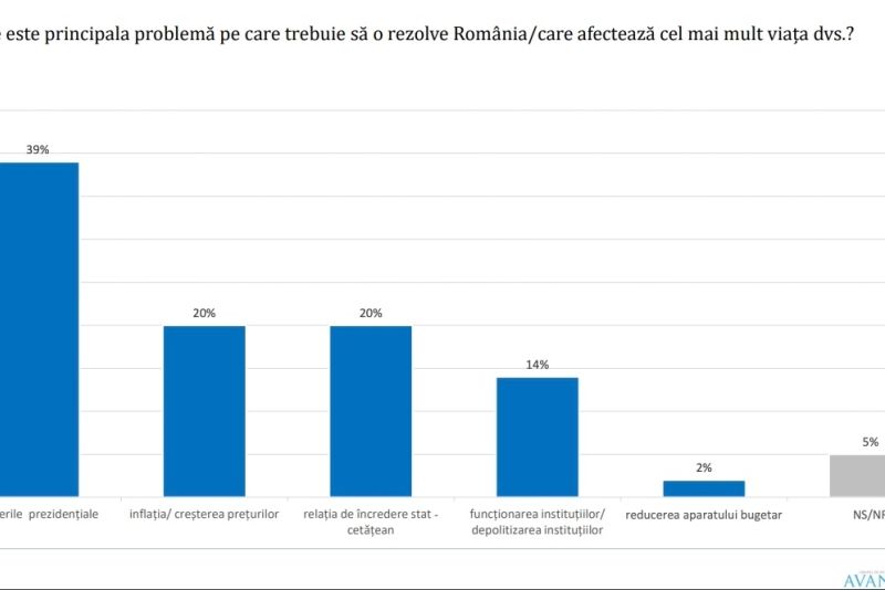 Potrivit sondajului AVANGARDE, cea mai mare grijă a României, în momentul de față, este reprezentată de alegerile prezidențiale. 39% dintre românii intervievați au indicat-o ca fiind principala problemă care le afectează viața. Urmează inflația și relația de încredere stat-cetățean (20%), funcționarea/depolitizarea instituțiilor (14%) și, abia pe ultimul loc, reducerea aparatului bugetar - prioritate pentru doar 2% dintre români.