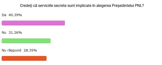 La întrebarea "Credeţi că serviciile secrete sunt implicate în alegerea Preşedintelui PNL?", peste 40% dintre cei chestionați au răspuns afirmativ.