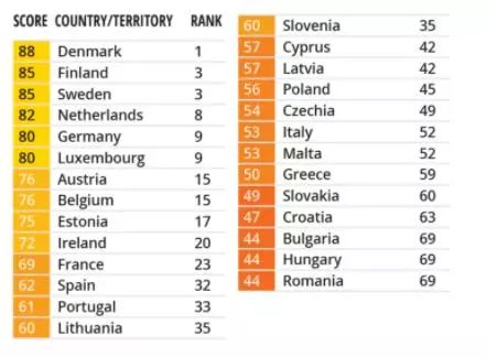 Uniunea Europeană este cea mai puțin coruptă regiune din lume, cu un scor mediu de 64/100. Cele mai "curate" țări europene sunt Danemarca, Finlanda și Suedia, cu punctaje de peste 85/100.