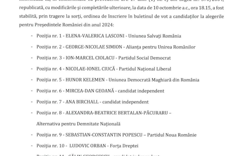 ALEGERILE INTRĂ IN LINIE DREAPTĂ. BEC A DEFINITIVAT ORDINEA CANDIDAȚILOR LA PREȘEDINȚIE PE BULETINUL DE VOT - DOCUMENT OFICIAL
