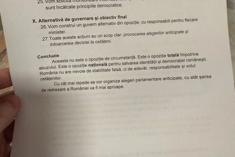 "Anunțăm un manifest adresat tuturor românilor, opoziției politice, mass‑mediei, sindicatelor, mediului de business și tuturor cetățenilor de bună credință care s-au săturat de această guvernare și vor acțiuni concrete. Opoziție totală, opoziție națională, un decalog de măsuri pe care îl transmitem către toți cetățenii României.