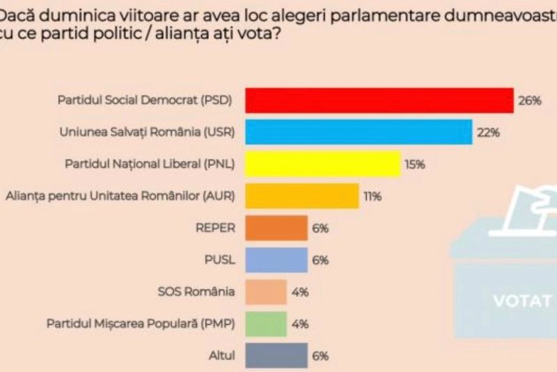 Dacă duminica viitoare ar avea loc alegeri parlamentare, bucureștenii ar vota în felul următor: PSD ar obține 26%, USR ar obține 22%, PNL 15%, cei de la AUR ar obține aproximativ 11%, în timp ce REPER și pe USL ar reuși să obțină 6%, deci să treacă pragul de cinci procente și să intre în Parlament.