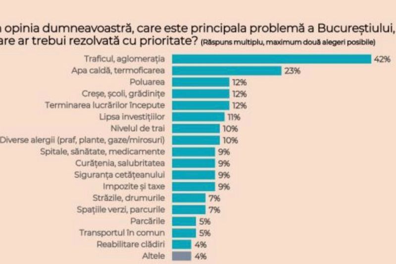 La întrebarea „care este principala problemă a Bucureștiului”, oamenii au at următoarele răspunsuri: traficul, lipsa apei calde, problema poluării, faptul că nu există creșe, școli sau grădinițe.