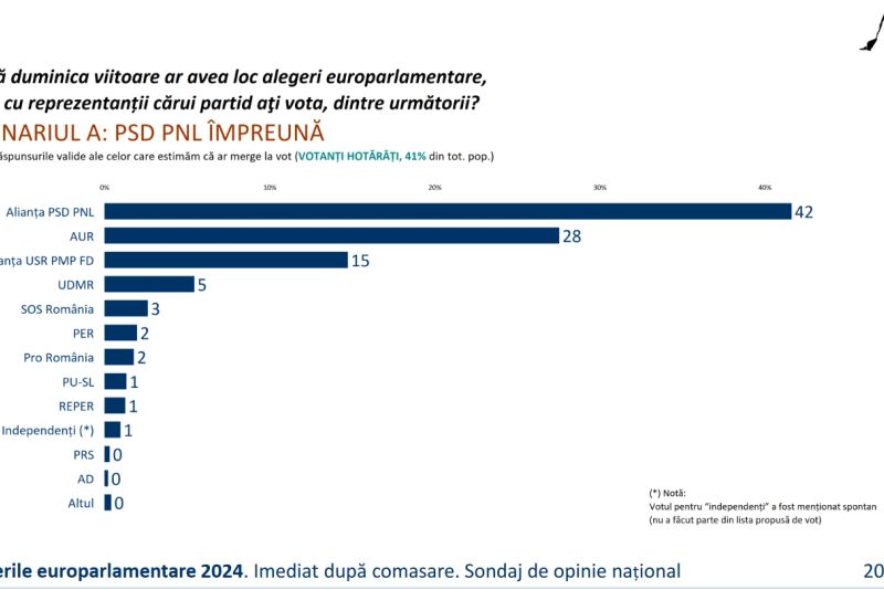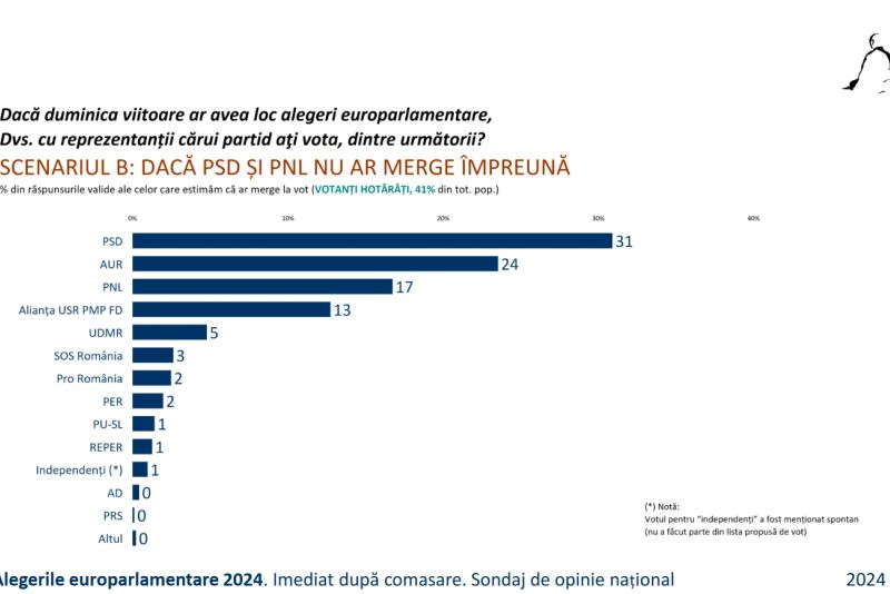 Cu toate acestea, în scenariul în care PNL și PSD merg separat, din rezultatele sondajului reiese că PSD ar obține 31% din voturi, urmat de AUR cu 24%, PNL cu 17%, și alianța USR, PMP și FD cu 13%.