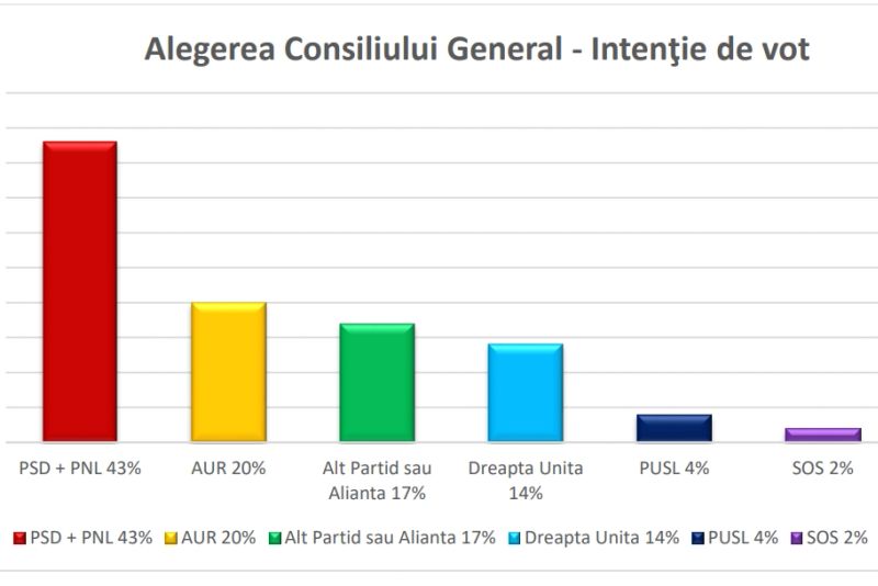 În ceea ce privește intenția de vot pentru alegerea Consiliului General, observăm cum alianța PSD + PNL ar câștiga detașat cu 43%, urmată de partidul AUR 20%. 17% dintre respondenți au indicat că ar vota pentru alt partid sau alianta, iar Dreapta Unita ar avea 14% dintre voturi. Aceștia sunt urmați de PUSL cu 4% și SOS cu 2%.